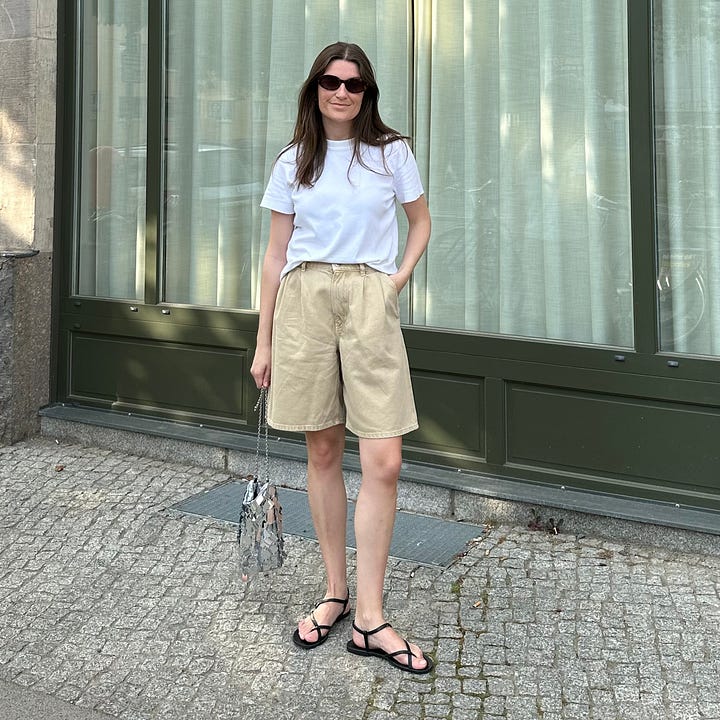 Why this piece works for me? I think my legs look great in this style of short. Shorter shorts also look fine on me, but I don’t have much of a behind so always quite conscious of that. I like that these are loose, voluminous and airy. I also only own blue and white denim shorts, so this was a new (be it trendy) colour in my collection.