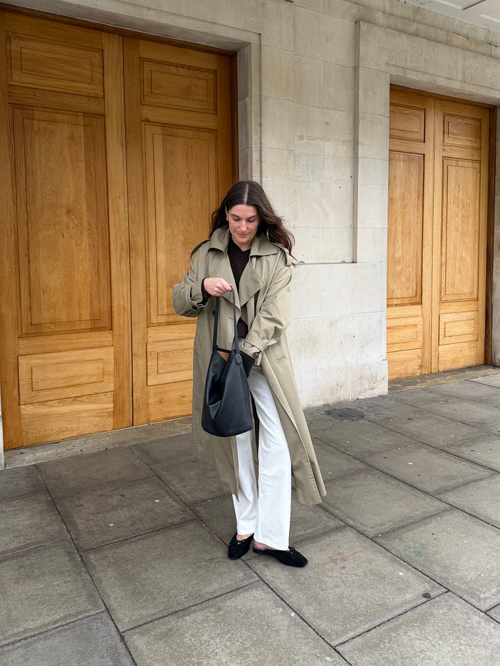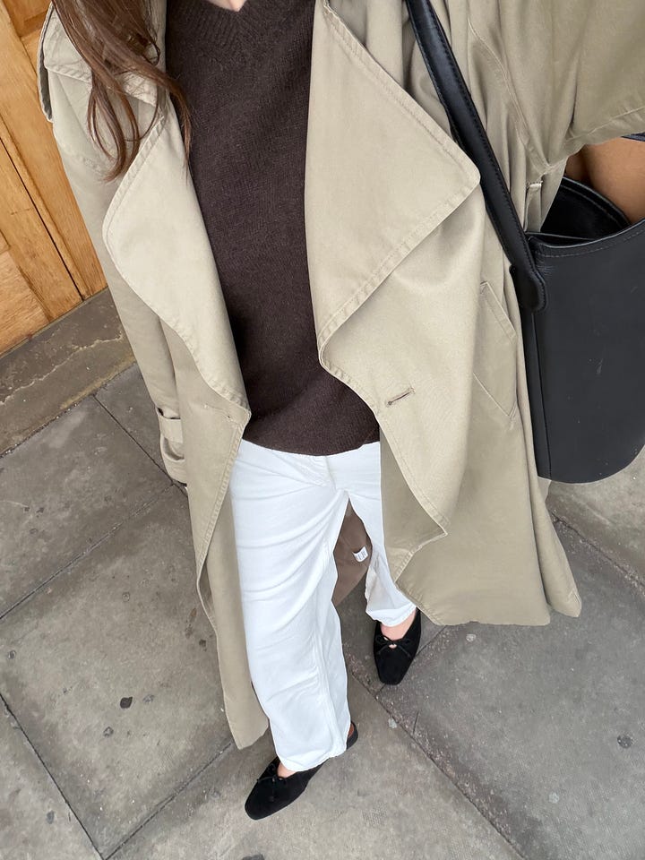 And on the 6th day of the week, it stopped raining! And it wasn’t freezing! Reading those sweet words ‘0% chance of precipitation’ and ‘feels like 12°C’ instantly had me feeling better about my wardrobe. An opportunity to white straight leg denim without it being splashed with rain water, open back ballerinas and a trench (albeit with a layer of cashmere underneath). I loved this look, and it’s got me really excited for spring dressing.